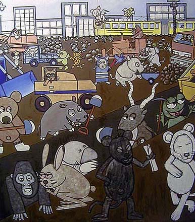 2000年の7月下旬から外で絵を描き始めました。その前にも田無のカレー屋さん 外壁に描いたのですが、不完全燃焼だったということもあり、工事現場の方からお話が来たときは二つ返事で受けました。
