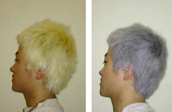 頭皮の痛みが限界になるまで脱色を続け、ペールイエローにします。(左図)